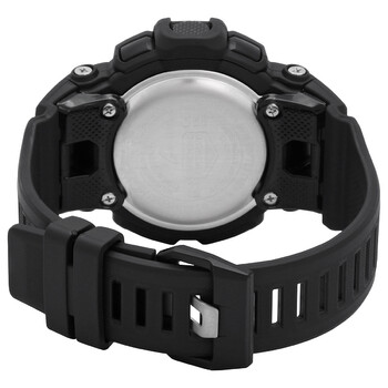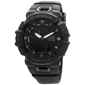 Black resin case and strap. Fixed black resin bezel. Black dial with black hands and index hour markers. Minute markers around the outer rim. Dial Type: Analog-digital. Quartz movement. Scratch resistant mineral crystal. Solid case back. Round case shape, case size: 51.3 mm x 48.9 mm. Buckle clasp. Water resistant at 200 meters / 660 feet. Functions: full time smartphone link, notification alert, phone finder, airplane mode, step tracker, auto double led light, 5 daily alarms & 1 snooze, 1/100 second stopwatch, 1/10 second timer, full auto calendar, dual time. G-shock Series. Sport watch style. Watch label: Japan Movt. Casio G-Shock Alarm Quartz Analog-Digital Black Dial Men's Watch GBA-900-1ADR.
