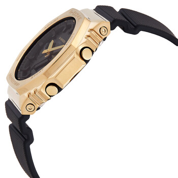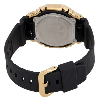 Gold-tone stainless steel case with a black resin strap. Fixed resin bezel. Black dial with gold-tone hands and index hour markers. Dial Type: Analog-digital. Luminescent neobrite. Full auto-calendar (to year 2099). Quartz movement. Scratch resistant mineral crystal. Solid case back. Round case shape, case size: 49.3 × 44.4 mm, case thickness: 11.8 mm. Buckle clasp. Water resistant at 200 meters / 660 feet. Functions: date, hour, minute, second, pm, month, 1/100-second stopwatch, world time, 5 daily alarms, 12/24-hour format, regular timekeeping. G-shock Series. Sport watch style. Watch label: Japan Movt. Casio G-Shock Alarm World Time Quartz Analog-Digital Black Dial Men's Watch GM2100G-1A9.