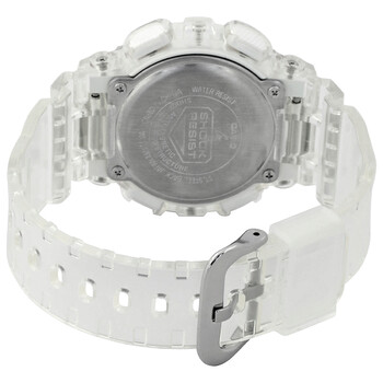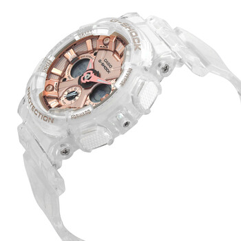 Transparent resin case and strap. Fixed transparent resin bezel. Rose gold dial with rose gold-tone hands and index hour markers. Dial Type: Analog-digital. Perpetual calendar. Chronograph - sub-dials displaying: digital. Casio Calibre 5518 quartz movement. Scratch resistant mineral crystal. Solid case back. Round case shape, case size: 49 mm x 45.9 mm, case thickness: 15.8 mm. Tang clasp. Water resistant at 200 meters / 660 feet. Functions: perpetual calendar, chronograph, world time, alarm, month, date, day, GMT, second time zone, hour, minute, second, shock resistant, magnetic resistant. G-shock Series. Sport watch style. Watch label: Japan Movt. Casio G-Shock Perpetual Alarm World Time Chronograph Quartz Analog-Digital Ladies Watch GMA-S120SR-7A.