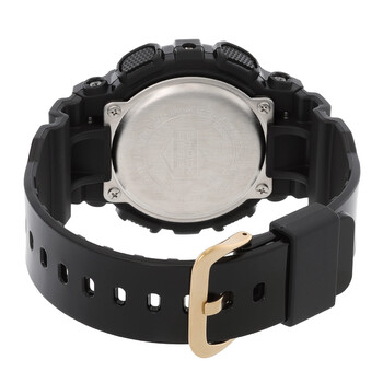 Black resin case and strap. Fixed black resin band bezel. Black dial with black hands and index hour markers. Minute markers around the outer rim. Dial Type: Analog-digital. Luminescent neobrite. Quartz movement. Scratch resistant mineral crystal. Solid case back. Round case shape, case size: 49 x 45.9 mm, case thickness: 15.8 mm. Buckle clasp. Water resistant at 200 meters / 660 feet. Functions: hour, minute, second, perpetual calendar, world time, 5 daily alarms, hourly time signal, 1/1000 second stopwatch, countdown timer, 12/24 hour format. G-shock Series. Sport watch style. Watch label: Japan Movt. Casio G-Shock World Time Quartz Analog-Digital Black Dial Ladies Watch GMAS110GB-1A.