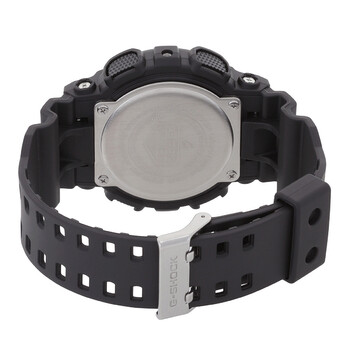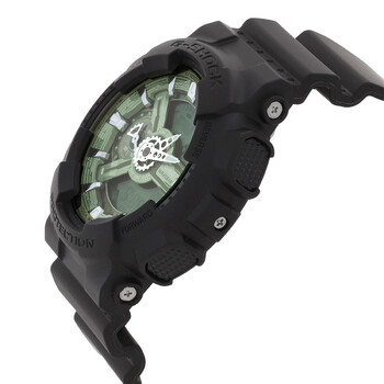 Black resin case and strap. Fixed black resin bezel. Green dial with silver-tone hands and index hour markers. Minute markers around the outer rim. Dial Type: Analog-digital. Full auto-calendar (to year 2099). Quartz movement. Scratch resistant mineral crystal. Solid case back. Round case shape, case size: 55 x 51.2 mm, case thickness: 16.9 mm. Buckle clasp. Water resistant at 200 meters / 660 feet. Functions: hour, minute, second, pm, month, date, day, world time, timer, 12/24-hour format, stopwatch, alarm. G-shock Series. Sport watch style. Casio G-Shock World Time Quartz Analog-Digital Green Dial Men's Watch GA-110CD-1A3.
