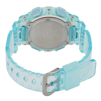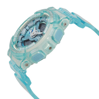 Transparent light blue resin case and strap. Fixed transparent light blue resin bezel. Digital dial with silver-tone hands and index hour markers. Minute markers around the outer rim. Dial Type: Analog-digital. Full auto-calendar (to year 2099). Quartz movement. Scratch resistant mineral crystal. Solid case back. Round case shape, case size: 49 x 45.9 mm, case thickness: 15.8 mm. Buckle clasp. Water resistant at 200 meters / 660 feet. Functions: hour, minute, second, pm, month, date, day, 12/24-hour format, world time, timer, stopwatch, alarm. G-shock Series. Sport watch style. Item Variations: GMA-S110VW-2ADR. Casio G-Shock World Time Quartz Analog-Digital Ladies Watch GMA-S110VW-2A.
