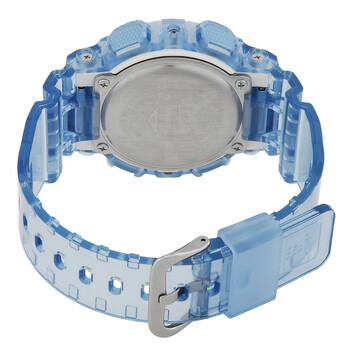 Transparent violet resin case and strap. Fixed transparent violet resin bezel. Digital dial with silver-tone hands and index hour markers. Minute markers around the outer rim. Dial Type: Analog-digital. Full auto-calendar (to year 2099). Quartz movement. Scratch resistant mineral crystal. Solid case back. Round case shape, case size: 49 x 45.9 mm, case thickness: 15.8 mm. Buckle clasp. Water resistant at 200 meters / 660 feet. Functions: hour, minute, second, pm, month, date, day, 12/24-hour format, world time, timer, stopwatch, alarm. G-shock Series. Sport watch style. Item Variations: GMA-S110VW-6ADR. Casio G-Shock World Time Quartz Analog-Digital Ladies Watch GMA-S110VW-6A.