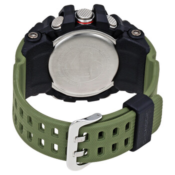 Black resin case with a green rubber strap. Fixed bezel. Digital dial with silver-tone hands and index hour markers. Minute markers around the outer rim. Dial Type: Analog-digital. Full auto calendar. Quartz movement. Scratch resistant mineral crystal. Case size: 56.2 mm x 55.3 mm. Case thickness: 17.1 mm. Round case shape. Tang clasp. Water resistant at 200 meters / 660 feet. Functions: hour, minute, second, digital compass, thermometer, led backlight, world time, 5 daily alarms, hourly time signal, 12/24 hour format. Additional Info: shock resistant, mud resistant. Casual watch style. Casio Master of G Digital Men's Watch GG1000-1A3.
