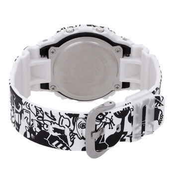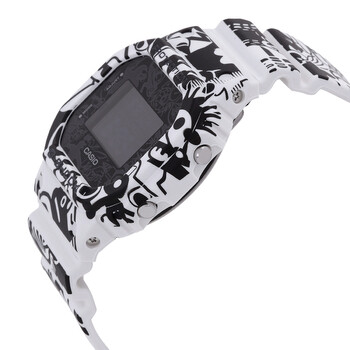 Black/white resin case and strap. Fixed black/white resin bezel. Digital dial with Arabic numeral hour markers. Dial Type: digital. Luminescent led. Full auto-calendar (to year 2099). Quartz movement. Scratch resistant mineral crystal. Pull / push crown. Solid case back. Square case shape, case size: 48.9 × 42.8 × 13.4 mm. Buckle clasp. Water resistant at 200 meters / 660 feet. Functions: day,date, hour, minute, second,1/100-second stopwatch,world time,12/24-hour format,hourly time signal, led light. Sport watch style. Watch label: Japan Movt. Item Variations: DW5600GU-7. Casio World Time Quartz Digital Unisex Watch DW5600-GU7.