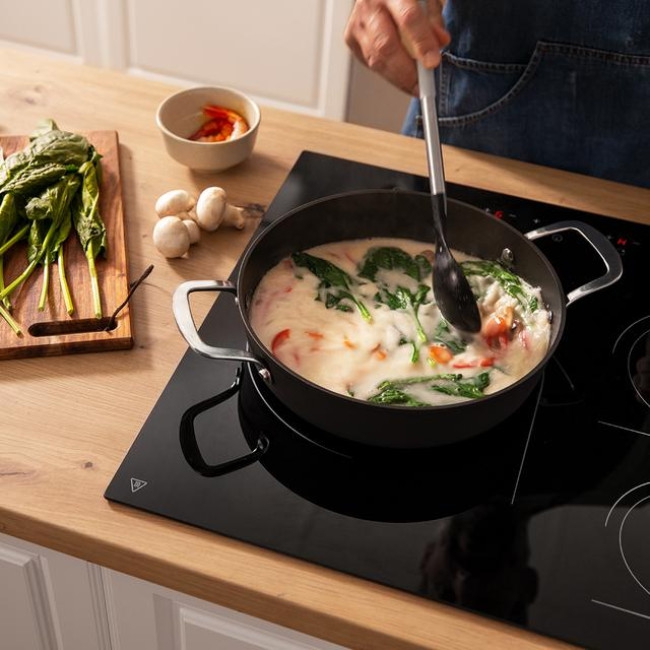 ალუმინის კორპუსის მეშვეობით სითბო თანაბრად გადანაწილდება და ინარჩუნებს სტაბილურად მაღალ ტემპერატურას, რაც ერთი მხრივ მნიშვნელოვნად ზოგავს ენერგიას და უზრუნველყოფს ენერგოეფექტურობას, ხოლო მეორე მხრივ უზრუნველყოფს პროდუქტის ერთგვაროვან მომზადებას. დაფარულია უკრავი ზედაპირით, მდგრადია ბზარებისა და ნაკაწრების მიმართ. შეგიძლიათ გარეცხოთ ხელით ან ჭურჭლის სარეცხ მანქანაში. გამოიყენება ნებისმიერ გაზქურაზე.