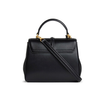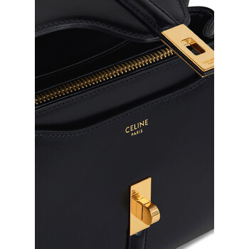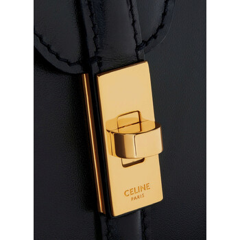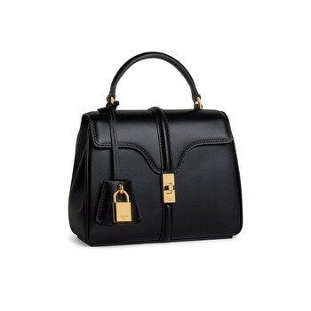 Celine Ladies Handbag. SKU: 197983BEY.38NO. Color: Black. The Celine Mini 16 Bag combines timeless elegance with versatile functionality. Crafted from satinated calfskin with a luxurious lambskin lining, its compact dimensions make it a perfect everyday accessory. Featuring gold-finished hardware, the bag's design is anchored by a classic turn-lock closure, exuding understated sophistication. Inside, the bag is thoughtfully organized with two main compartments, an inner flat pocket, a zipped pocket, and an outer flat pocket discreetly placed beneath the flap. Designed for multiple carrying options, it includes a sleek top handle with a 3-inch drop and a removable leather strap with a 19-inch drop for shoulder or crossbody wear. Size: 7 x 6 x 4 inches. Made in Italy.