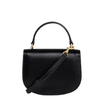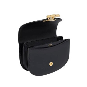 Celine Ladies Mini Bag. SKU: 10L063ETZ.38NO. Color: Black. Size: 6" x 5" x 2". Celine Clea Besace Bag. The bag features a gold finishing and offers hand carry, shoulder carry, and cross-body carry options. It has a Triomphe metallic snap button closure, one main compartment, and two inner flat pockets. The removable and adjustable strap provides a minimum drop. 100% Lambskin.