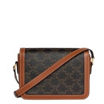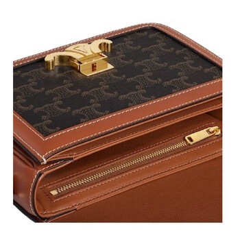 Celine Ladies Shoulder Bag. SKU: 188882BZ4.04LU. Color: Tan. Size: 7" x 5" x 3". Celine Teen Triomphe Bag. These bag features a gold finishing, allowing for both cross-body and shoulder carry. It is designed with a Triomphe metallic closure, three inner compartments, one inner zipped pocket, and one inner flat pocket. Additionally, the adjustable strap offers a minimum drop of 14 inches and a maximum drop of 20 inches. Made from calfskin and canvas.