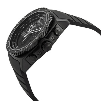 Black ion-plated stainless steel case with a black rubber strap. Fixed black ion-plated bezel showing tachymeter markings. Black dial with silver-tone skeleton hands and index hour markers. Minute markers. Arabic numeral seconds markers (at 5 minute intervals) around the outer rim. Dial Type: Analog. Date display at the 4 o'clock position. Chronograph - three sub-dials displaying: 60 second, 12 hour and 1/10th of a second. ETA caliber 251.233 COSC quartz movement. Scratch resistant sapphire crystal. Screw down crown. Solid case back. Round case shape. Case size: 45 mm. Case thickness: 12.45 mm. Band width: 22 mm. Tang clasp. Water resistant at 100 meters / 330 feet. Functions: chronograph, rattrapante, date, hour, minute, small second, chronometer. Ds Master Series. Sport watch style. Watch label: Swiss Made. Certina Chronograph Quartz Black Dial Men's Watch C0154341705000.