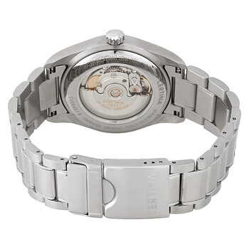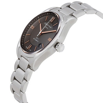 Stainless steel case with a stainless steel bracelet. Fixed stainless steel bezel. Grey dial with rose gold-tone hands and index hour markers. Roman numerals mark the 3, 6, 9 and 12 o'clock positions. Minute markers around the outer rim. Dial Type: Analog. Date display between the 4 and 5 o'clock positions. ETA Caliber 2824-2 automatic movement with a 38-hour power reserve. Scratch resistant sapphire crystal. Screw down crown. Transparent case back. Case size: 39 mm. Case thickness: 12 mm. Round case shape. Fold over deployment clasp. Water resistant at 100 meters / 330 feet. Functions: date, hour, minute, second. Dress watch style. Watch label: Swiss Made. Certina DS 1 Automatic Grey Dial Men's Watch C0064071108801.