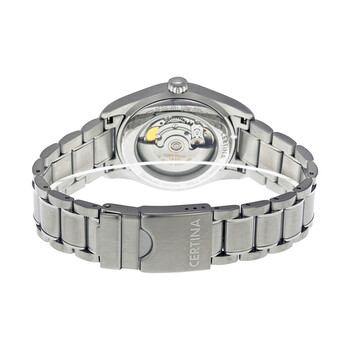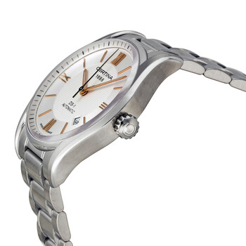 Stainless steel case with a stainless steel bracelet. Fixed stainless steel bezel. Silver dial with rose gold-tone hands and index hour markers. Roman numerals mark the 3, 6, 9 and 12 o'clock positions. Minute markers around the outer rim. Dial Type: Analog. Luminescent hands. Date display between the 4 and 5 o'clock positions. Automatic movement with a 38-hour power reserve. Scratch resistant sapphire crystal. Skeleton case back. Case diameter: 39 mm. Case thickness: 12 mm. Round case shape. Band width: 20 mm. Fold over clasp. Water resistant at 100 meters / 330 feet. Functions: date, hour, minute, second. Sport watch style. Watch label: Swiss Made. Certina DS 1 Automatic Silver Dial Stainless Steel Men's Watch C006.407.11.038.01.