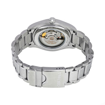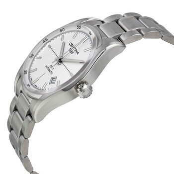 Stainless steel case with a stainless steel bracelet. Fixed stainless steel bezel. White dial with silver-tone hands and index hour markers. Minute markers around the outer rim. Dial Type: Analog. Date display between the 4 and 5 o'clock positions. ETA caliber 2824-2 automatic movement with a 38-hour power reserve. Scratch resistant sapphire crystal. Pull / push crown. Skeleton case back. Round case shape. Case size: 39 mm. Case thickness: 11.98 mm. Band width: 20 mm. Fold over clasp. Water resistant at 100 meters / 330 feet. Functions: date, hour, minute, second. Sport watch style. Watch label: Swiss Made. Item Variations: C006 407 11 031 00, C006-407-11-031-00, C006/407/11/031/00, C0064071103100. Certina DS 1 Automatic White Dial Men's Watch C006.407.11.031.00.