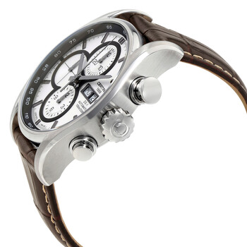 Stainless steel case with a brown leather strap. Fixed stainless steel bezel. Silver dial with solid hands and index hour markers. Minute markers. Tachymeter markings around the outer rim. Dial Type: Analog. Day of the week and date display at the 3 o'clock position. Chronograph - three sub-dials displaying: 60 second, 30 minute and 12 hour. ETA 7750 Valjoux automatic movement with a 44-hour power reserve. Scratch resistant sapphire crystal. Skeleton case back. Case size: 43 mm. Round case shape. Tang clasp. Water resistant at 100 meters / 330 feet. Functions: chronograph, day, date, hour, minute, second. Sport watch style. Watch label: Swiss Made. Certina DS 1 - Chronograph Automatic Men's Watch C0064141603100.
