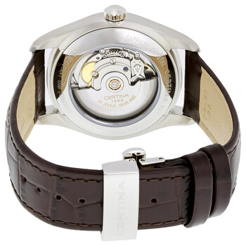 Stainless steel case with a brown leather strap. Fixed stainless steel bezel. Grey dial with luminous hands and index hour markers. Minute markers around the outer rim. Dial Type: Analog. Luminescent hands and markers. Date display at the 6 o'clock position. Day of the week display centered on the 12 o'clock position. ETA 2824-2 automatic movement with a 38-hour power reserve. Scratch resistant sapphire crystal. Skeleton case back. Case size: 39 mm. Case thickness: 12 mm. Round case shape. Band width: 20 mm. Tang clasp. Water resistant at 100 meters / 330 feet. Functions: date, day, hour, minute, second. Casual watch style. Watch label: Swiss Made. Certina DS 1 Day Date Automatic Men's Watch C0064301608100.