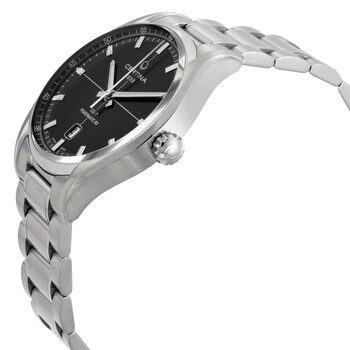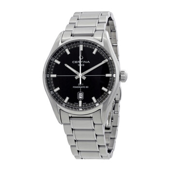 Stainless steel case with a stainless steel bracelet. Fixed stainless steel bezel. Black dial with luminous hands and index hour markers. Minute markers around the outer rim. Dial Type: Analog. Luminescent hands and markers. Date display at the 6 o'clock position. Certina calibre Powermatic 80 (ETA C07.111) automatic movement with an 80-hour power reserve. Scratch resistant sapphire crystal. Pull / push crown. Transparent case back. Round case shape. Case size: 40 mm. Case thickness: 13 mm. Band width: 21 mm. Butterfly clasp with a push button release. Water resistant at 100 meters / 330 feet. Functions: date, hour, minute, second. Casual watch style. Watch label: Swiss Made. Certina DS -1 Powermatic 80 Automatic Men's Watch C029.407.11.051.00.