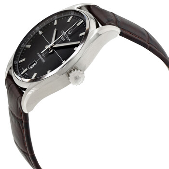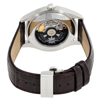 Stainless steel case with a brown (calfskin) leather strap. Fixed stainless steel bezel. Grey dial with luminous silver-tone hands and index hour markers. Minute markers around the outer rim. Dial Type: Analog. Date display at the 6 o'clock position. Certina calibre Powermatic 80 (ETA C07.111) automatic movement with an 80-hour power reserve. Scratch resistant sapphire crystal. Pull / push crown. Transparent case back. Round case shape. Case size: 40 mm. Case thickness: 12 mm. Band width: 21 mm. Tang clasp. Water resistant at 100 meters / 330 feet. Functions: date, hour, minute, second. Casual watch style. Watch label: Swiss Made. Certina DS -1 Powermatic 80 Automatic Men's Watch C029.407.16.081.00.
