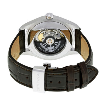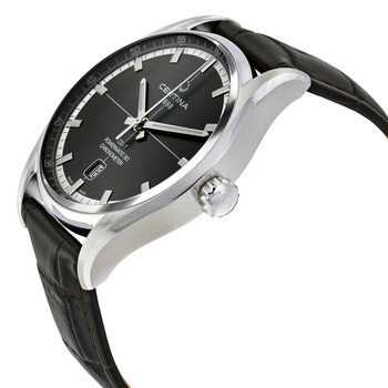 Stainless steel case with a brown (calfskin) leather strap. Fixed stainless steel bezel. Grey dial with luminous silver-tone hands and index hour markers. Arabic numeral hour markers (at 5 minute intervals). Minute markers around the outer rim. Dial Type: Analog. Luminescent hands and markers. Date display at the 6 o'clock position. Powermatic 80.111 COSC automatic movement with an 80-hour power reserve. Scratch resistant sapphire crystal. Pull / push crown. Transparent case back. Round case shape. Case size: 40 mm. Case thickness: 13 mm. Band width: 21 mm. Fold over clasp with a safety release. Water resistant at 100 meters / 330 feet. Functions: date, hour, minute, second, chronometer. Casual watch style. Watch label: Swiss Made. Certina DS -1 Powermatic 80 Automatic Men's Watch C029.408.16.081.00.