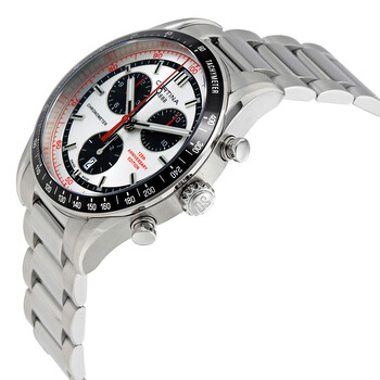 Stainless steel case with a stainless steel bracelet. Fixed stainless steel bezel with a black PVD top ring showing tachymeter markings. Silver dial with luminous hands and index hour markers. Minute markers. 1/100th markers around the outer rim. Dial Type: Analog. Luminescent hands and markers. Date display at the 6 o'clock position. Chronograph - three black sub-dials displaying: 60 second, 30 minute and 12 hour. Quartz movement. Scratch resistant sapphire crystal. Pull / push crown. Solid case back. Case size: 41 mm. Case thickness: 13 mm. Round case shape. Band width: 20 mm. Deployment clasp with a push button release. Water resistant at 100 meters / 330 feet. Functions: chronograph, tachymeter, date, hour, minute, second. Additional Info: suitable for snorkeling as well as swimming but not diving. Sport watch style. Watch label: Swiss Made. Certina DS - 2 Chrono Stainless Steel Men's Quartz Watch C0244481103100.