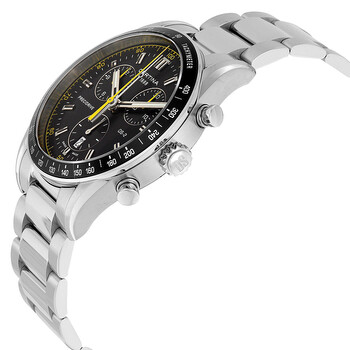 Stainless steel case with a stainless steel bracelet. Fixed stainless steel bezel with a black top ring showing tachymeter markings. Black dial with luminous silver-tone hands and index hour markers. Minute markers. 1/100th markings around the outer rim. Dial Type: Analog. Luminescent hands. Date display at the 6 o'clock position. Chronograph - three sub-dials displaying: 30 minute, 60 seconds, 12 hours. Quartz movement. Scratch resistant sapphire crystal. Screw down crown. Solid case back. Case diameter: 41 mm. Case thickness: 12 mm. Round case shape. Bracelet width: 20 mm. Deployment clasp with a push button release. Water resistant at 100 meters / 330 feet. Functions: date, hour, minute, second. Casual watch style. Watch label: Swiss Made. Certina DS 2 Chronograph Black Dial Men's Stainless Steel Watch C024.447.11.051.01.