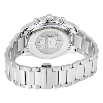 Stainless steel case with a stainless steel bracelet. Fixed stainless steel bezel with a black top ring showing tachymeter markings. Black dial with luminous hands and index hour markers. Minute markers. 1/100th second markers around the outer rim. Dial Type: Analog. Luminescent hands and markers. Date display at the 6 o'clock position. Chronograph - three sub-dials displaying: 30 minute, 60 secondsand 12 hours. ETA caliber 251.264 quartz movement. Scratch resistant sapphire crystal. Screw down crown. Solid case back. Case size: 41 mm. Case thickness: 12.54 mm. Round case shape. Bracelet width: 20 mm. Deployment clasp with a push button release. Water resistant at 100 meters / 330 feet. Functions: chronograph, tachymeter, date, hour, minute, second, tachymeter. Sport watch style. Watch label: Swiss Made. Certina DS 2 Chronograph Black Dial Men's Watch C024.447.11.051.02.