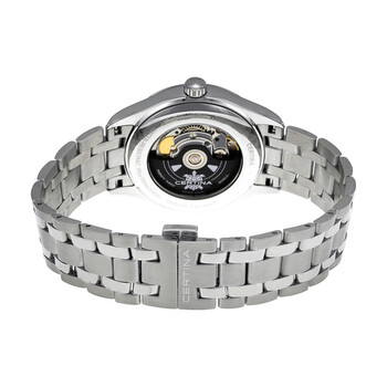 Silver-tone stainless steel case with a silver-tone stainless steel bracelet. Fixed silver-tone stainless steel bezel. Black dial with luminous hands and index hour markers. Minute markers around the outer rim. Dial Type: Analog. Luminescent hands and markers. Date display at the 6 o'clock position. Certina Calibre Powermatic 80 (ETA C07.111) Automatic movement, based upon ETA 2824-2, containing 23 Jewels, bitting at 21600 vph, and has a power reserve of approximately 80 hours. Scratch resistant sapphire crystal. Pull / push crown. Skeleton case back. Round case shape, case size: 39 mm, case thickness: 10 mm. Deployment with push button release clasp. Water resistant at 100 meters / 330 feet. Functions: date, hour, minute, second. Ds-8 Powermatic 80 Series. Casual watch style. Watch label: Swiss Made. Certina DS- 8 Automatic Black Dial Men's Watch C0334071105100.