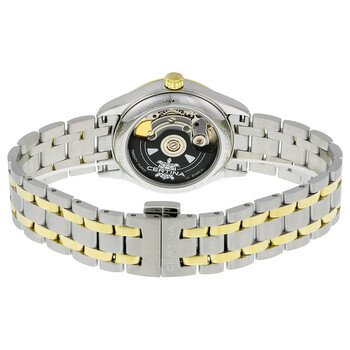 Silver-tone stainless steel case with a two-tone (silver-tone and gold-tone) stainless steel bracelet. Fixed gold-tone stainless steel bezel. Silver dial with luminous gold-tone hands and sticks hour markers. Minute markers around the outer rim. Dial Type: Analog. Luminescent hands and markers. Date display at the 6 o'clock position. Certina Calibre Powermatic 80 (ETA C07.111) Automatic movement, based upon ETA 2824-2, containing 23 Jewels, bitting at 21600 vph, and has a power reserve of approximately 80 hours. Scratch resistant sapphire crystal. Pull / push crown. Skeleton case back. Round case shape, case size: 31.50 mm, case thickness: 9.8 mm. Deployment with push button release clasp. Water resistant at 100 meters / 330 feet. Functions: date, hour, minute, second. Ds-8 Powermatic 80 Series. Casual watch style. Watch label: Swiss Made. Certina DS- 8 Automatic Silver Dial Ladies Watch C0332072203100.