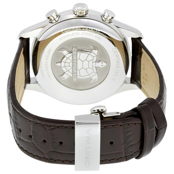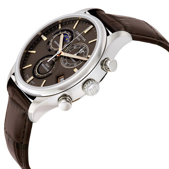 Stainless steel case with a brown (calfskin) leather strap. Fixed stainless steel bezel. Brown dial with luminous rose gold-tone hands and index hour markers. Minute markers around the outer rim. Dial Type: Analog. Luminescent hands and markers. Date display at the 4 o'clock position. Three sub-dials displaying: 60 second, 60 minute and moonphase/average length of lunar cycle indicator. ETA caliber G10.962 BH PRD Precidrive quartz movement. Scratch resistant sapphire crystal. Solid case back. Round case shape. Case size: 42 mm. Case thickness: 11 mm. Band width: 20 mm. Tang clasp. Water resistant at 100 meters / 330 feet. Functions: chronograph, moonphase, date, hour, minute, second. Additional Info: suitable for snorkeling as well as swimming but not diving. Ds-8 Chrono Moon Phase Series. Casual watch style. Watch label: Swiss Made. Certina DS- 8 Chrono Moon Phase Men's Quartz Watch C0334501608100.