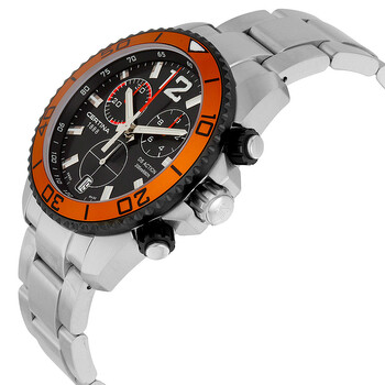 Stainless steel case with a stainless steel bracelet. Rotating black bezel with an orange top ring. Black dial with luminous hands and index hour markers. An Arabic numeral appears at the 12 o'clock position. Minute markers. Tachymeter around the outer rim. Dial Type: Analog. Luminescent hands and markers. Date display at the 6 o'clock position. Chronograph - three sub-dials displaying: 60 second, 30 minute and 1/10th of a second. Quartz movement. Scratch resistant sapphire crystal. Screw down crown. Solid case back. Case diameter: 42.50 mm. Case thickness: 13 mm. Round case shape. Deployment clasp with push button release. Water resistant at 200 meters / 660 feet. Functions: chronograph, tachymeter, date, hour, minute, second. Sport watch style. Watch label: Swiss Made. Certina DS Action Chronograph Black Dial Men's Watch C0134172105701.