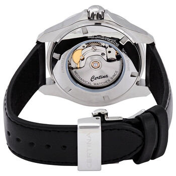 Stainless steel case with a black (embossed calfskin) leather strap. Fixed stainless steel bezel. Black dial with luminous silver-tone hands and index hour markers. Minute markers around the outer rim. Dial Type: Analog. Luminescent hands and markers. Day of the week and date display at the 3 o'clock position. Powermatic 80 automatic movement with an 80-hour power reserve. Scratch resistant sapphire crystal. Screw down crown. Transparent case back. Round case shape. Case size: 41 mm. Case thickness: 11,96 mm. Band width: 19 mm. Butterfly clasp. Water resistant at 200 meters / 660 feet. Functions: date, day, hour, minute, second. DS Action Day-Date Series. Casual watch style. Watch label: Swiss Made. Certina DS Action Day-Date Automatic Black Dial Men's Watch C032.430.16.051.00.