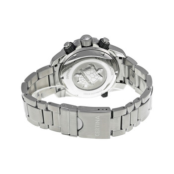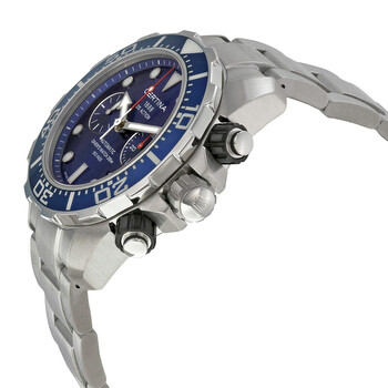 Stainless steel case with a stainless steel bracelet. Uni-directional rotating stainless steel bezel with blue lacquer fill. Blue dial with luminous silver-tone hands and index hour markers. Minute markers around the outer rim. Dial Type: Analog. Luminescent hands and markers. Date display between 4 and 5 o'clock positions. Chronograph - two sub-dials displaying: 60 second and 30 minute. Automatic movement with a 44 hour power reserve. Scratch resistant sapphire crystal. Screw down crown. Solid case back. Case diameter: 45.20 mm. Case thickness: 15 mm. Round case shape. Bracelet width: 20 mm. Fold over clasp with a safety release. Water resistant at 200 meters / 660 feet. Functions: chronograph, date, hour, minute, second. Additional Info: diver watch. Sport watch style. Watch label: Swiss Made. Certina DS Action Diver Chronograph Blue Dial Men's Watch C013.427.11.041.00.