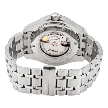 Stainless steel case with a stainless steel bracelet. Fixed stainless steel bezel. Black dial with luminous silver-tone hands and index hour markers. Minute markers around the outer rim. Dial Type: Analog. Luminescent hands and markers. Day of the week and date display at the 3 o'clock position. Powermatic 80 automatic movement with an 80-hour power reserve. Scratch resistant sapphire crystal. Screw down crown. Transparent case back. Round case shape. Case size: 41 mm. Case thickness: 11.96 mm. Band width: 20 mm. Butterfly clasp. Water resistant at 200 meters / 660 feet. Functions: date, day, hour, minute, second. Casual watch style. Watch label: Swiss Made. Certina DS Action Automatic Black Dial Men's Watch C032.430.11.051.00.