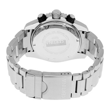 Stainless steel case with a stainless steel bracelet. Rotating stainless steel bezel with an black top ring. Black dial with luminous hands and index hour markers. An Arabic numeral appears at the 12 o'clock position. Minute markers. Tachymeter around the outer rim. Dial Type: Analog. Luminescent hands and markers. Date display at the 6 o'clock position. Chronograph - three sub-dials displaying: 60 second, 30 minute and 1/10th of a second. Quartz movement. Scratch resistant sapphire crystal. Screw down crown. Solid case back. Case diameter: 42.50 mm. Case thickness: 13 mm. Round case shape. Band width: 21 mm. Deployment clasp with push button release. Water resistant at 200 meters / 660 feet. Functions: chronograph, tachymeter, date, hour, minute, second. Sport watch style. Watch label: Swiss Made. Certina DS Action Quartz Black Dial Stainless Steel Men's Watch C0134171105700