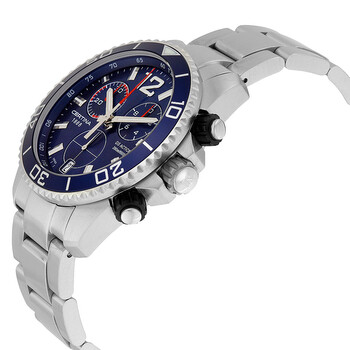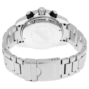 Stainless steel case with a stainless steel bracelet. Rotating stainless steel bezel with an blue top ring. Blue dial with luminous hands and index hour markers. An Arabic numeral appears at the 12 o'clock position. Minute markers. Tachymeter around the outer rim. Dial Type: Analog. Luminescent hands and markers. Date display at the 6 o'clock position. Chronograph - three sub-dials displaying: 60 second, 30 minute and 1/10th of a second. Quartz movement. Scratch resistant sapphire crystal. Screw down crown. Solid case back. Case diameter: 42.50 mm. Case thickness: 13 mm. Round case shape. Band width: 21 mm. Deployment clasp with push button release. Water resistant at 200 meters / 660 feet. Functions: chronograph, tachymeter, date, hour, minute, second. Sport watch style. Watch label: Swiss Made. Certina DS Action Quartz Blue Dial Stainless Steel Men's Watch C0134171104700.
