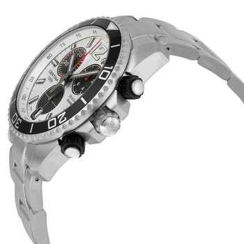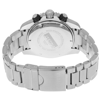 Stainless steel case with a stainless steel bracelet. Rotating stainless steel bezel with an black top ring. Silver dial with luminous hands and index hour markers. An Arabic numeral appears at the 12 o'clock position. Minute markers. Tachymeter around the outer rim. Dial Type: Analog. Luminescent hands and markers. Date display at the 6 o'clock position. Chronograph - three sub-dials displaying: 60 second, 30 minute and 1/10th of a second. Quartz movement. Scratch resistant sapphire crystal. Screw down crown. Solid case back. Case diameter: 42.50 mm. Case thickness: 13 mm. Round case shape. Band width: 21 mm. Deployment clasp with push button release. Water resistant at 200 meters / 660 feet. Functions: chronograph, tachymeter, date, hour, minute, second. Sport watch style. Watch label: Swiss Made. Certina DS Action Quartz Silver Dial Stainless Steel Men's Watch C0134171103700.