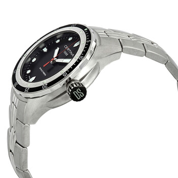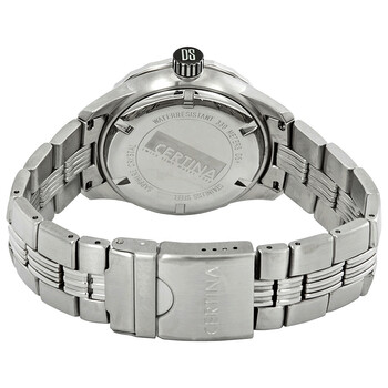 Stainless steel case with a stainless steel bracelet. Uni-directional rotating black and silver-tone bezel. Black dial with luminous silver-tone hands and dot hour markers. Minute markers around the outer rim. Dial Type: Analog. Luminescent hands and markers. Date display at the 3 o'clock position. ETA 955.112 quartz movement. Scratch resistant sapphire crystal. Solid case back. Round case shape. Case size: 43 mm. Case thickness: 14 mm. Band width: 21 mm. Fold over clasp with a safety release. Water resistant at 330 meters / 1000 feet. Functions: date, hour, minute, second. Casual watch style. Watch label: Swiss Made. Certina DS Blue Ribbon Black Dial Men's Watch C0074101105101.