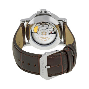 Stainless steel case with a brown leather strap. Fixed stainless steel bezel. Silver dial with rose gold-tone hands and index hour markers. Arabic numerals mark the 3, 9 mand 12 o'clock position. Minute markers around the outer rim. Dial Type: Analog. Date display at the 6 o'clock position. Automatic movement with a 38 hour power reserve. Scratch resistant sapphire crystal. Skeleton case back. Case diameter: 38 mm. Case thickness: 10.4 mm. Round case shape. Water resistant at 100 meters / 330 feet. Functions: date, hour, minute, second. Sport watch style. Watch label: Swiss Made. Certina DS Caimano Automatic Silver Dial Brown Leather Men's Watch C017.407.16.037.01.