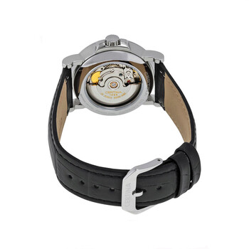 Stainless steel case with a black (calfskin) leather strap. Fixed stainless steel bezel. Silver dial with gunmetal hands and index hour markers. Arabic numerals mark the 3, 9 and 12 o'clock positions. Minute markers around the outer rim. Dial Type: Analog. Date display at the 6 o'clock position. Automatic movement with a 38 hour power reserve. Scratch resistant sapphire crystal. Skeleton case back. Case diameter: 38 mm. Case thickness: 10.4 mm. Round case shape. Strap width: 21 mm. Tang clasp. Water resistant at 100 meters / 330 feet. Functions: date, hour, minute, second. Sport watch style. Watch label: Swiss Made. Certina DS Caimano Automatic Silver Dial Men's Watch C017.407.16.037.00.