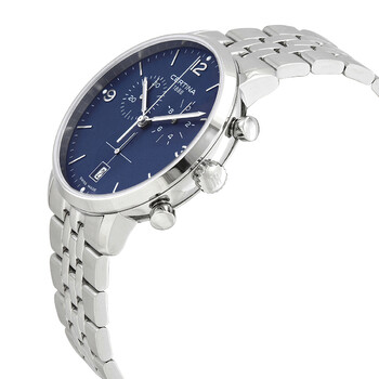 Stainless steel case with a stainless steel bracelet. Fixed stainless steel bezel. Blue dial with luminous silver-tone hands and index hour markers. Arabic numerals mark the 3, 9 and 12 o'clock positions. Minute markers around the outer rim. Dial Type: Analog. Luminescent hands. Date display at the 6 o'clock position. Chronograph - three sub-dials displaying: 60 second, 30 minute and 1/10th of a second. PrecidriveTM quartz movement. Scratch resistant sapphire crystal. Solid case back. Case size: 40 mm. Case thickness: 11.51 mm. Band width: 20 mm. Fold over clasp. Water resistant at 100 meters / 330 feet. Functions: chronograph, date, hour, minute, second. Ds Caimano Series. Casual watch style. Watch label: Swiss Made. Certina DS Caimano Chronograph Quartz Blue Dial Watch C035.417.11.047.00.