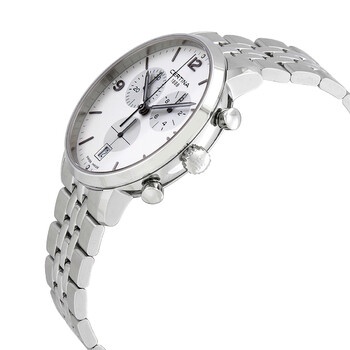 Silver-tone stainless steel case and bracelet. Fixed stainless steel bezel. Silver dial with black hands and index hour markers. Arabic numerals mark the 3, 9 and 12 o'clock positions. Minute markers around the outer rim. Dial Type: Analog. Luminescent hands. Date display at the 6 o'clock position. Chronograph - three sub-dials displaying: 60 second, 30 minute and 1/10th of a second. PrecidriveTM quartz movement. Scratch resistant sapphire crystal. Solid case back. Round case shape, case size: 42 mm, case thickness: 11.51mm. Band width: 21 mm. Fold over clasp. Water resistant at 100 meters / 330 feet. Functions: chronograph, date, hour, minute, second. Ds Caimano Series. Casual watch style. Watch label: Swiss Made. Certina DS Caimano Chronograph Quartz Silver Dial Watch C035.417.11.037.00.