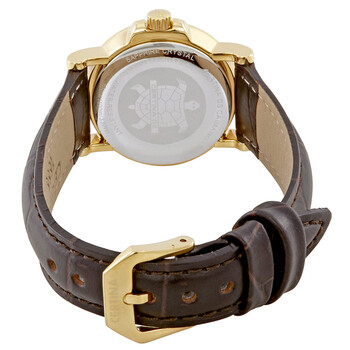 Gold-tone stainless steel case with a brown leather strap. Fixed gold-tone bezel. Black dial with luminous gold-tone hands and index hour markers. Arabic numerals appear at the 3, 9 and 12 o'clock positions. Dial Type: Analog. Luminescent hands. Date display above the 6 o'clock position. ETA caliber F03.111 quartz movement. Scratch resistant sapphire crystal. Pull / push crown. Solid case back. Round case shape. Case size: 27 mm. Case thickness: 7 mm. Band width: 15 mm. Tang clasp. Water resistant at 100 meters / 330 feet. Functions: date, hour, minute, second. Ds Caimano Series. Casual watch style. Watch label: Swiss Made. Certina DS Caimano Quartz Black Dial Ladies Watch C017.210.36.087.00.