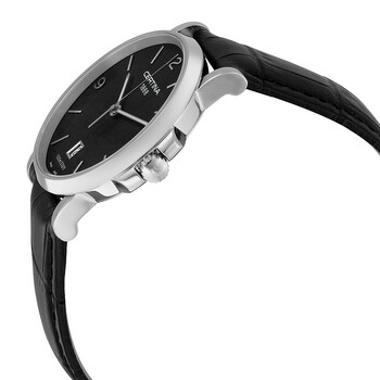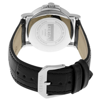 Stainless steel case with a black leather strap. Fixed stainless steel bezel. Black dial with solid hands and index hour markers. Arabic numerals mark the 3, 9 and 12 o'clock positions. Dial Type: Analog. Luminescent hands. Date display at the 6 o'clock position. Quartz movement. Scratch resistant sapphire crystal. Pull / push crown. Solid case back. Case diameter: 38 mm. Case thickness: 9 mm. Round case shape. Band width: 21 mm. Tang clasp. Water resistant at 100 meters / 330 feet. Functions: date, hour, minute, second. Casual watch style. Watch label: Swiss Made. Certina DS Caimano Quartz Black Dial Black Leather Men's Watch C0174101605700.