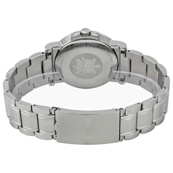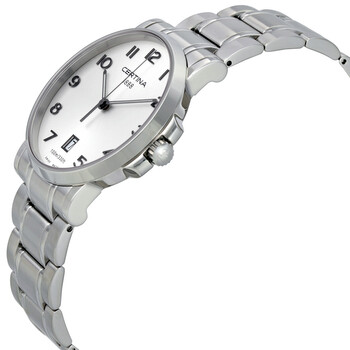 Silver-tone stainless steel case and bracelet. Fixed silver-tone stainless steel bezel. Silver dial with luminous black hands and Arabic numeral hour markers. Dial Type: Analog. Luminescent hands. Date display above the 6 o'clock position. Quartz movement. Scratch resistant sapphire crystal. Pull / push crown. Solid case back. Round case shape, case size: 38 mm, case thickness: 11 mm. Band width: 20 mm. Deployment with push button release clasp. Water resistant at 100 meters / 330 feet. Functions: date, hour, minute, second. Ds Caimano Series. Casual watch style. Watch label: Swiss Made. Certina DS Caimano Silver Dial Men's Watch C0174101103200.