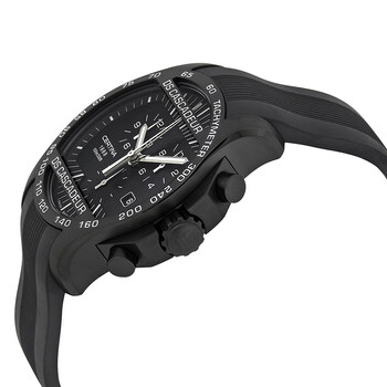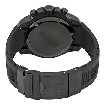Black PVD stainless steel case with a black rubber strap. Fixed black PVD bezel showing tachymeter markings. Black dial with luminous silver-tone hands and index hour markers. Minute markers around the outer rim. Dial Type: Analog. Luminescent hands and markers. Date display at the 4 o'clock position. Chronograph - three sub-dials displaying: 60 second, 12 hours and 1/10th of a second. Quartz movement. Scratch resistant sapphire crystal. Screw down crown. Solid case back. Case size: 42 mm. Case thickness: 13 mm. Round case shape. Band width: 21 mm. Band length: 8 inches. Fold over clasp. Water resistant at 100 meters / 330 feet. Functions: chronograph, tachymeter, date, hour, minute, second. Casual watch style. Watch label: Swiss Made. Certina DS Cascadeur Chronograph Men's Watch C003.617.17.050.00.