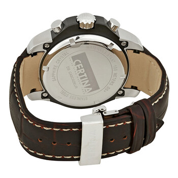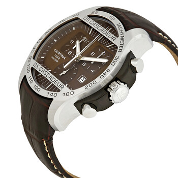 Stainless steel case with a brown leather strap. Fixed stainless steel bezel showing tachymeter markings. Brown dial with luminous silver-tone hands and index hour markers. Minute markers around the outer rim. Dial Type: Analog. Luminescent hands and markers. Date display at the 4 o'clock position. Chronograph - three sub-dials displaying: 60 second, 12 hour and 1/10th of a second. ETA caliber 251.262 quartz movement. Scratch resistant sapphire crystal. Solid case back. Round case shape. Case size: 42 mm. Case thickness: 13.8 mm. Band width: 21 mm. Deployment clasp. Water resistant at 100 meters / 330 feet. Functions: chronograph, date, hour, minute, small second. Ds Cascadeur Series. Casual watch style. Watch label: Swiss Made. Certina DS Cascadeur Chronograph Men's Watch C003.617.26.290.00.