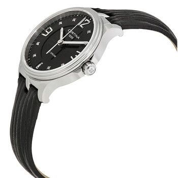Stainless steel case with a black leather strap. Fixed stainless steel bezel. Black dial with luminous silver-tone hands and diamond hour markers. Arabic numerals mark the 3, 9 and 12 o'clock positions. Minute markers around the outer rim. Dial Type: Analog. Luminescent hands. Date display at the 6 o'clock position. ETA caliber F06.111 quartz movement. Scratch resistant sapphire crystal. Pull / push crown. Solid case back. Round case shape. Case size: 30.5 mm. Case thickness: 7.4 mm. Band width: 14 mm. Deployment clasp. Water resistant at 100 meters / 330 feet. Functions: date, hour, minute, second. Dress watch style. Watch label: Swiss Made. Certina DS Dream Diamond Black Dial Ladies Watch C021.210.16.056.00.