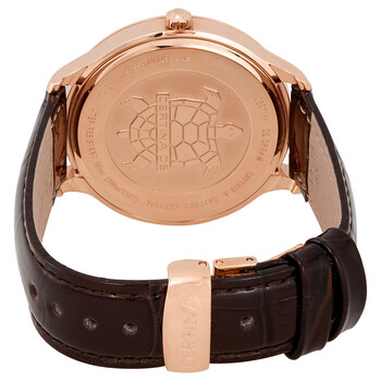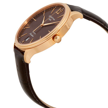 Rose gold-tone stainless steel case with a brown leather strap. Fixed rose gold-tone stainless steel bezel. Brown dial with rose gold-tone alpha-style shape hands and index hour markers. Arabic numeral appears at the 12 o'clock position. Dial Type: Analog. Luminescent hands. Date display at the 6 o'clock position. ETA Caliber F07.411 quartz movement. Scratch resistant sapphire crystal. Pull / push crown. Solid case back. Round case shape, case size: 38 mm, case thickness: 7.47 mm. Band width: 18 mm. Tang clasp. Water resistant at 100 meters / 330 feet. Functions: date, hour, minute, second. Casual watch style. Watch label: Swiss Made. Certina DS Dream Precidrive Brown Dial Ladies Watch C021.810.36.297.00.
