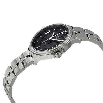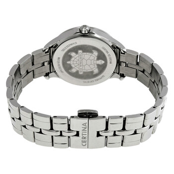 Stainless steel case with a stainless steel bracelet. Fixed stainless steel bezel. Black dial with luminous silver-tone hands and diamond hour markers. Arabic numerals appear at the 3, 9 and 12 o'clock positions. Minute markers around the outer rim. Dial Type: Analog. Luminescent hands. Date display at the 6 o'clock position. ETA caliber F06.111 quartz movement. Scratch resistant sapphire crystal. Pull / push crown. Solid case back. Round case shape. Case size: 30.5 mm. Case thickness: 7.4 mm. Bracelet width: 14 mm. Deployment clasp with a push button release. Water resistant at 100 meters / 330 feet. Functions: date, hour, minute, second. DS Dream Series. Casual watch style. Watch label: Swiss Made. Certina DS Dream Stainless Steel Ladies Quartz Watch C021.210.11.056.00.