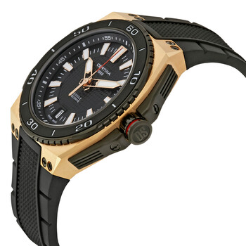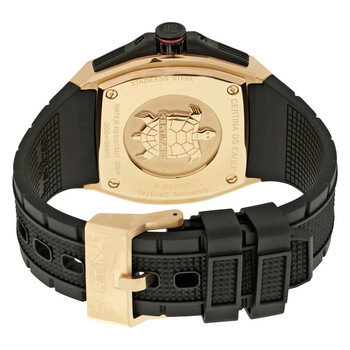 Rose gold-tone stainless steel case with a black rubber strap. Fixed black PVD bezel. Black dial with luminous rose gold-tone hands and index hour markers. Minute markers around the outer rim. Dial Type: Analog. Luminescent hands and markers. Date display at the 6 o'clock position. Quartz movement. Scratch resistant sapphire crystal. Screw down crown. Solid case back. Case size: 44 mm. Tonneau case shape. Tang clasp. Water resistant at 200 meters / 660 feet. Functions: date, hour, minute, second. Casual watch style. Watch label: Swiss Made. Certina DS Eagle Black Dial Men's Quartz Watch C023.710.37.051.00.