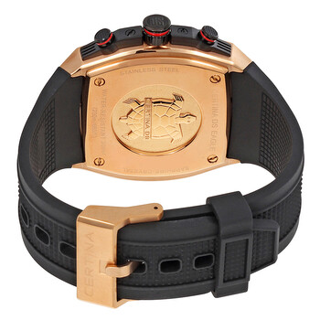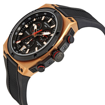 Rose gold-tone stainless steel case with a black rubber strap. Fixed black carbon bezel. Black dial with luminous rose gold-tone hands and index hour markers. Minute markers. Tachymeter markings around the outer rim. Dial Type: Analog. Luminescent hands and markers. Date display at the 6 o'clock position. Three sub-dials displaying: 60 second, 24 hour and 12 hour. ETA calibre G10.961 quartz movement. Scratch resistant sapphire crystal. Screw down crown. Solid case back. Case size: 46 mm. Case thickness: 13.9 mm. Tonneau case shape. Tang clasp. Water resistant at 200 meters / 660 feet. Functions: chronograph, tachymeter, date, hour, minute, second. Additional Info: suitable for professional marine activity serious surface water sports and skin diving. Sport watch style. Watch label: Swiss Made. Certina DS Eagle GMT Black Rubber Men's Quartz Watch C0237393705100.